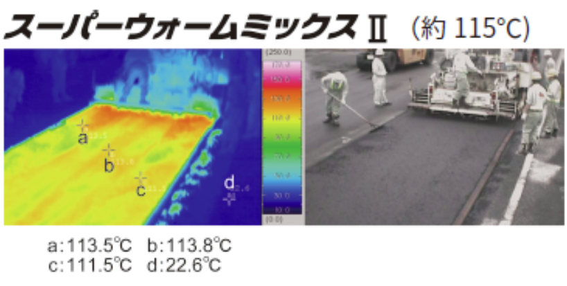 ・アスファルト混合物の混合温度を、従来のアスファルト混合物と比較して30℃程度低減できるため、製造時に排出される二酸化炭素の量が約20%低減され、地球温暖化現象の抑制に寄与することができる。