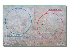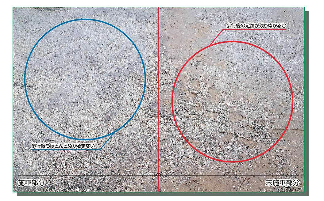 高強度ゴムチップの弾性層に高強度(物性)のフルウレタン材を塗布。エンボス仕上げで透水機能を保持。