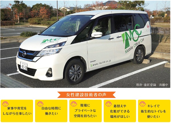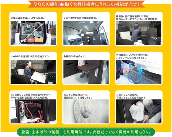 ・プライベート空間を確保できる移動式現場事務所車となるため、建設現場の女性が働きやすい環境を提供できる。