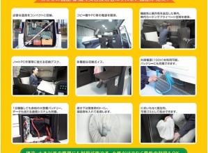 一般車に、収納機能付き椅子とテーブル、大容量バッテリー、モニター、wi-fi、プリンター、汚物処理機能付きトイレ、外部電源取り出し機能、LEDルームランプ、後部座席ウィンドウフィルムおよびカーテンを装備した。