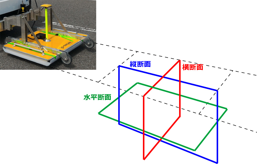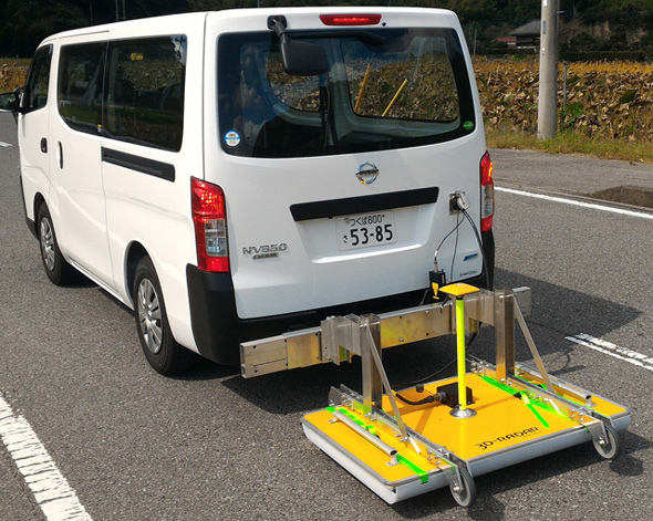 ・車両による牽引調査に変えた事により、一般車両と同等速度で測定できるため、調査時間(工程)の短縮ならびに施工性(調査性)の向上が図れる。