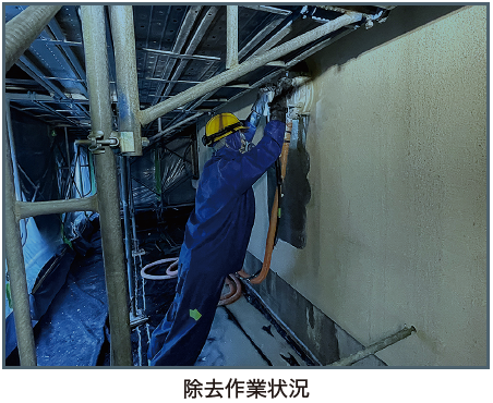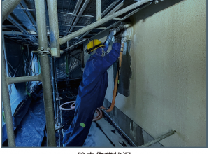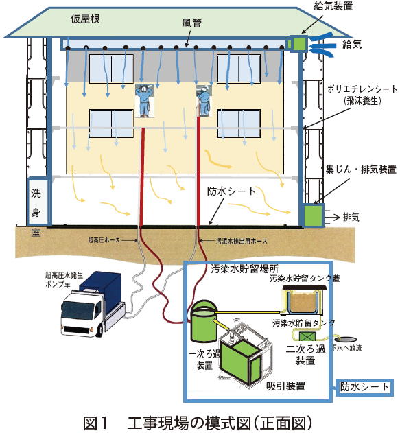 一般的な集塵装置付きグラインダー工法と集塵装置付超高圧水洗工法との間に位置するアスベスト除去工...
