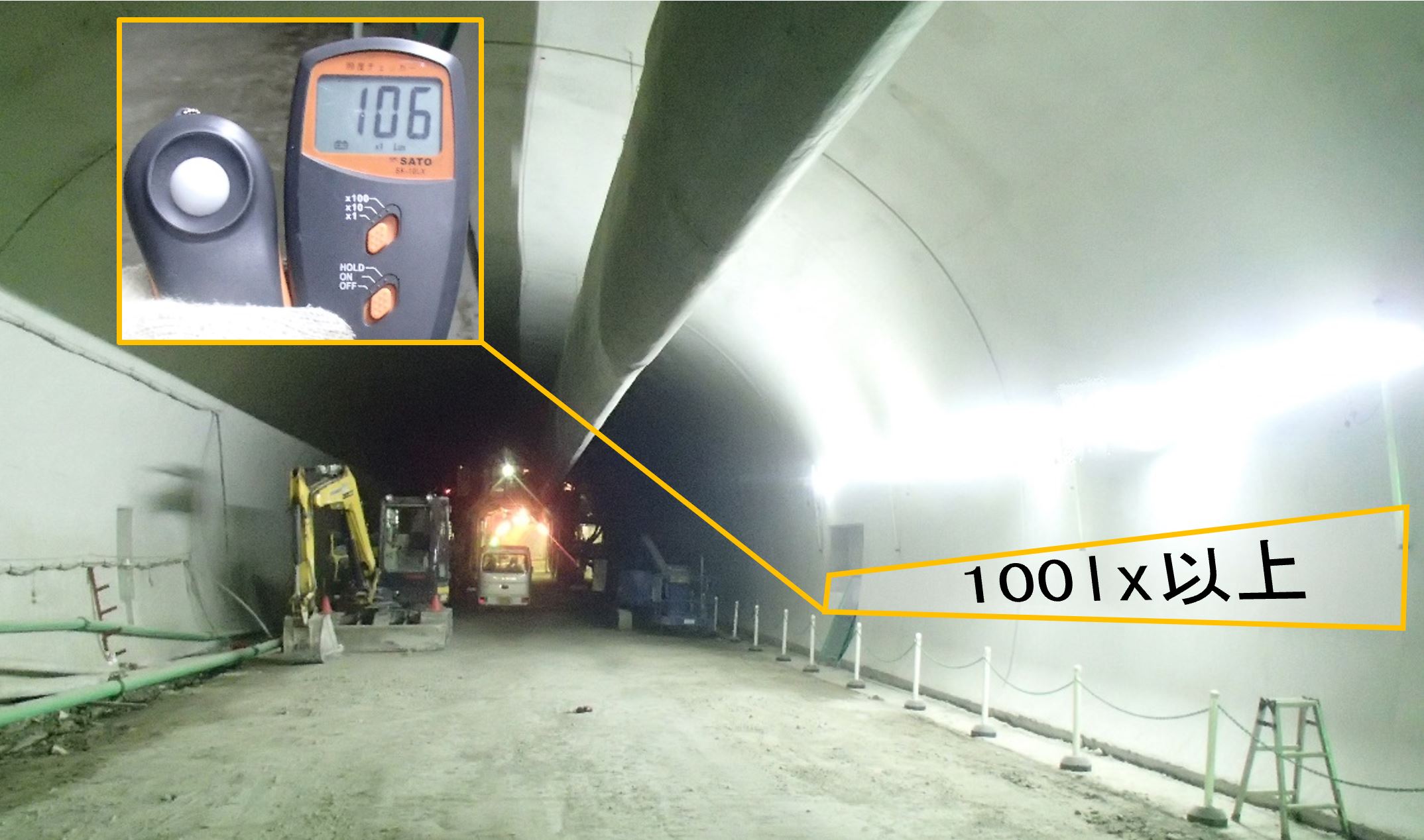 インバーター内蔵型基板と高輝度LED素子を採用し、従来のシリンダーライトと同等な消費電力で、シリンダーライト以上の照度を実現できた。また、当該帯ライトを最大100mまで延伸でき、トンネル工事など長距離線形構造物の照明に便利に対応できるようになった。