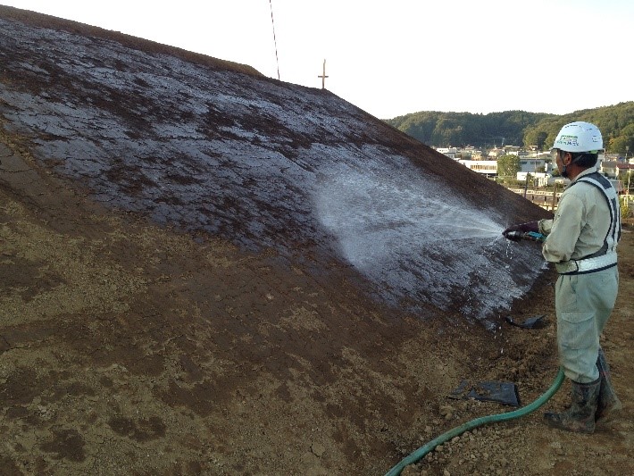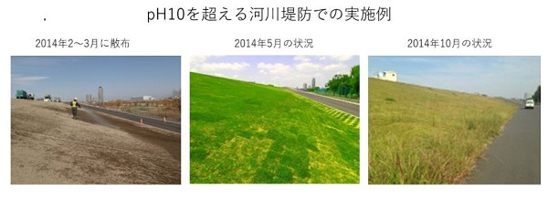 アルカリ法面を緑化するための土壌の置換を、液状中和剤を散布する方法に変えた。