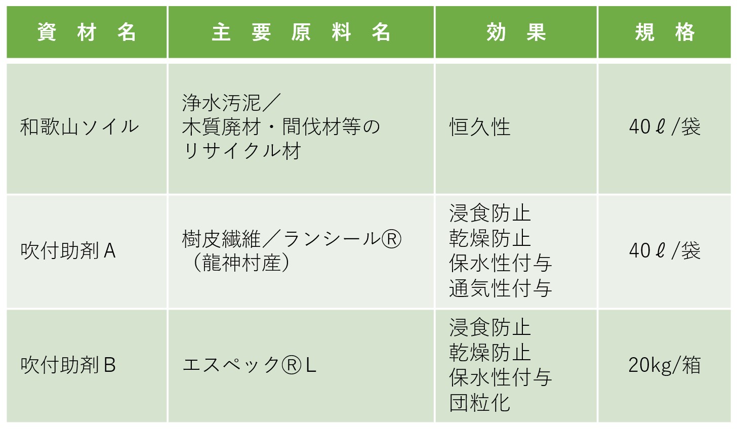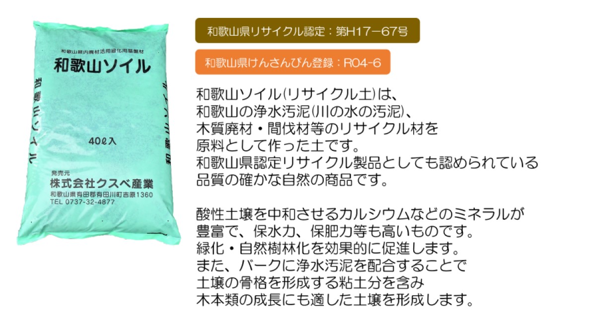 ・浄水汚泥・木質廃材を利用しており、ミネラル分に富み、保肥力がある。植生に必要な粘性土と養分・堆肥が豊富な土壌を形成する。