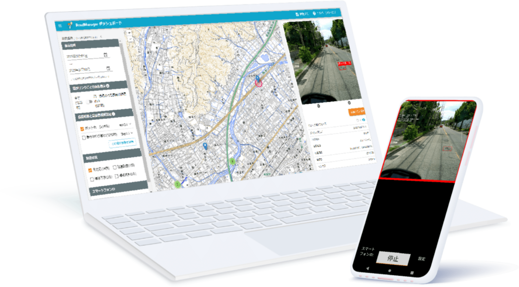 「道路損傷による事故を未然に防ぎたい道路管理者」向けの「AIによる道路損傷検知サービス」。スマートフォンを車に載せて走るだけで、事故につながる損傷を個人の判断によらず画像から自動で検知が可能。また、検知した損傷はWEBダッシュボードで検索し、作業指示書を出力することができる。