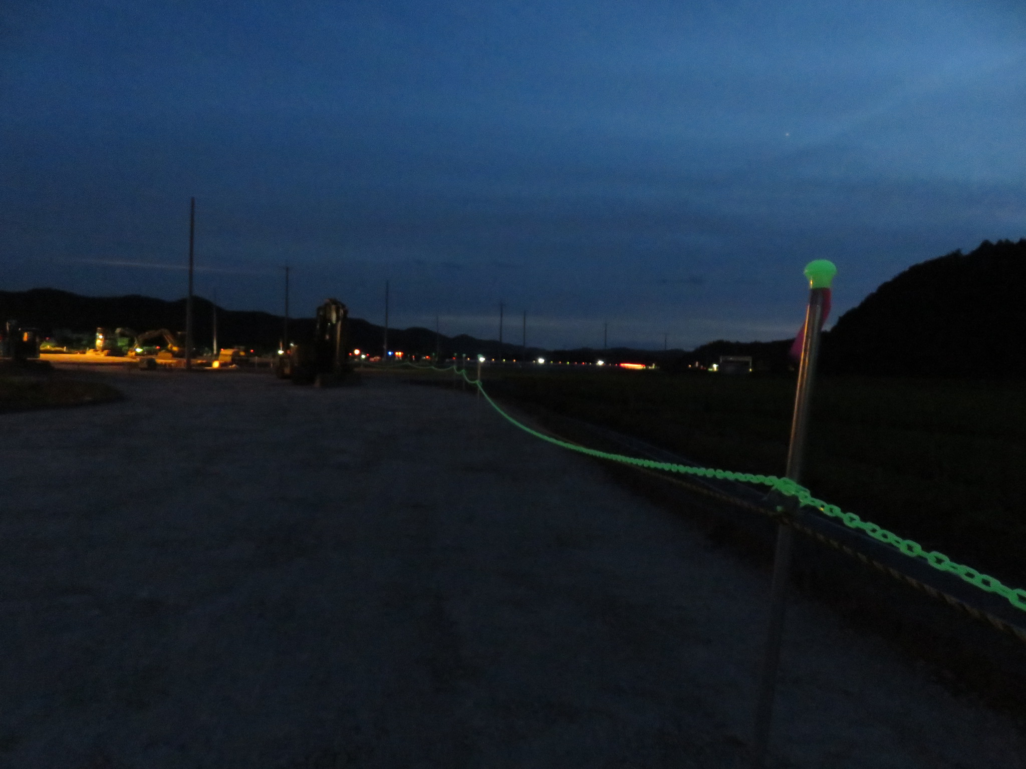 高輝度蓄光プラスチックチェーンの蓄光による夕暮れ時の発光にて、工事区域表示の視認性が高まり安全性の向上が期待できる。