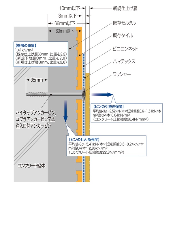本技術の外装材は既存構造物の仕上げ層の上からカチオン系樹脂モルタルとビニロンネットを被覆して新たに下地層を構築し、アンカーピンで躯体に固定したうえで、天然石・セラミック骨材からなる特殊高耐候性アクリル樹脂(ハマキャスト)及びトップコート(ハマトップ#10000)を吹き付け、自然石調外装材とする3層構造になっているため、長寿命であると考えている。