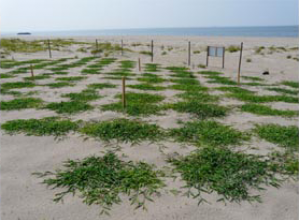 ・掘削した箇所にマット状の植生基盤(1m四方)を市松張りにして埋戻しするのみであること、かつ、面倒な静砂垣の編込作業等が不要なことから、施工性が単純であり、静砂 垣+砂草植生工法に比べ施工性が向上する。