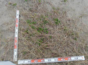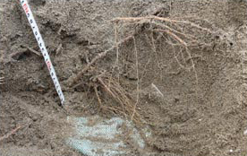 ・はまみどり工法により形成された植生は、従来工法によって形成された植生よりも地上部及び根系部ともに植被率が高いため、砂浜安定化と飛砂防止効果の向上が期待さ れる。