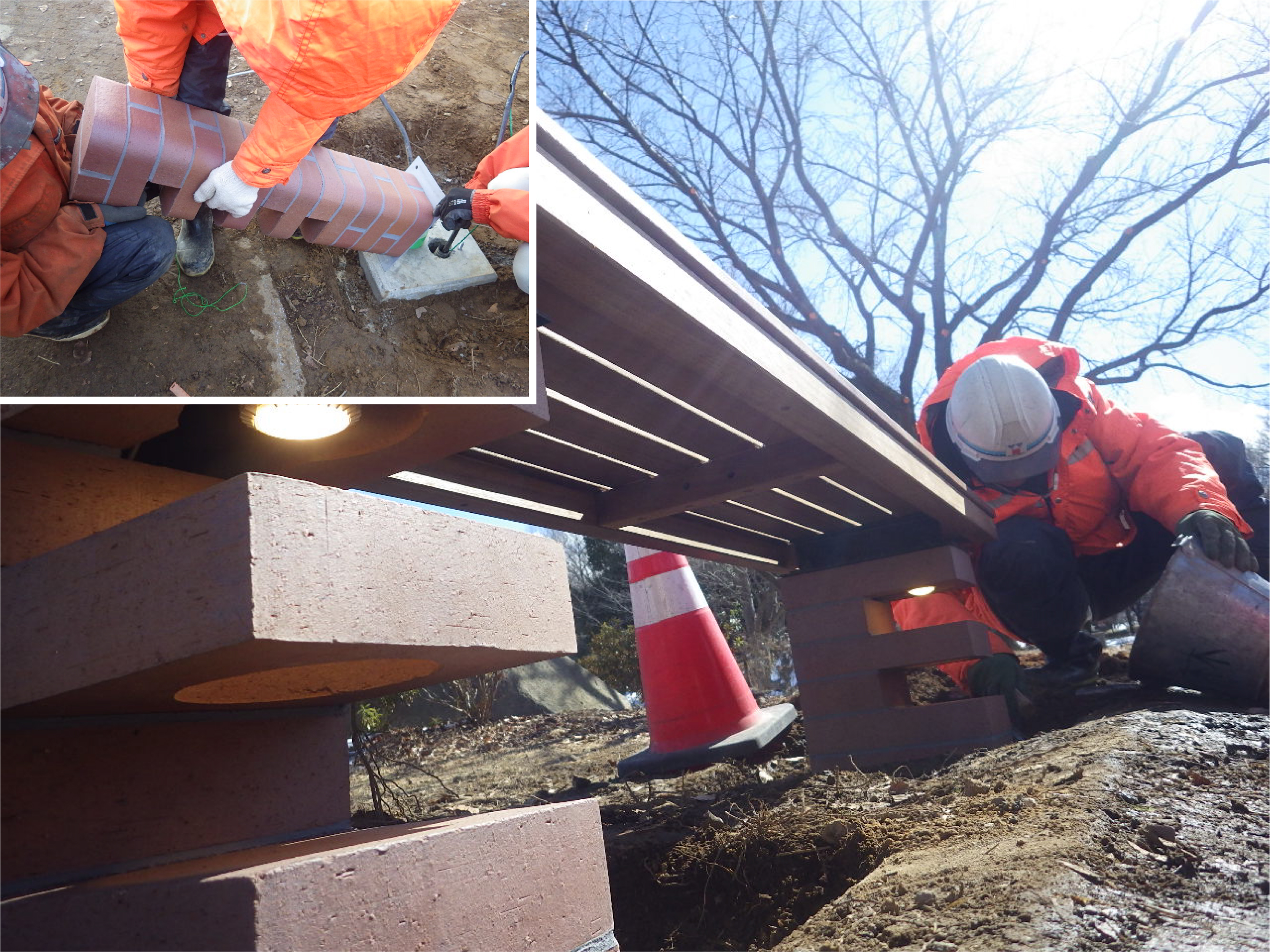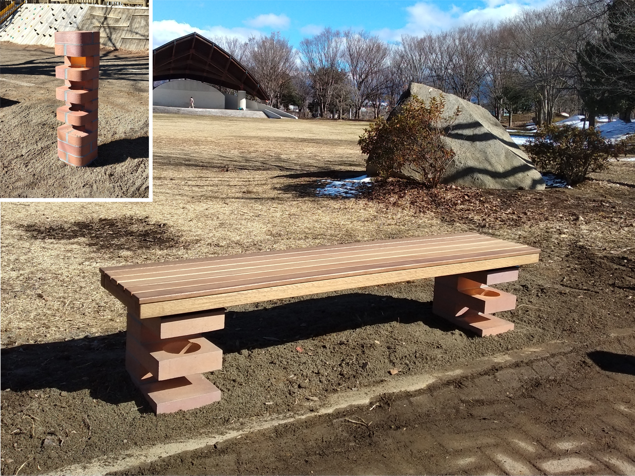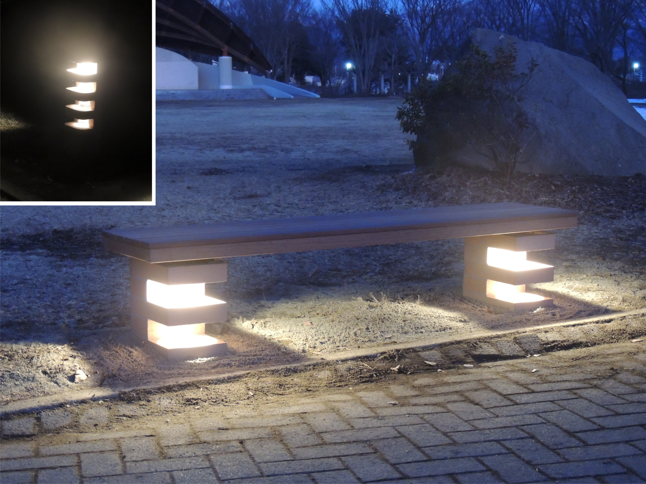 煉瓦×フットライト、煉瓦照明×ベンチという斬新な組み合わせによる先例のない製品