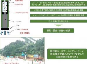基礎工のダウンザホールハンマにおいて、特殊なファーストケーシングを取り付けるだけで振動、騒音、粉塵を低減できる工法。