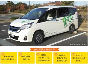 建設現場の女性に働きやすい環境を提供する、現場に直行直帰が可能な移動式現場事務所車。