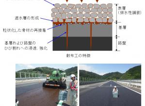 排水性舗装の比較的軽微な損傷時に浸透型補修材(特殊改質アスファルト乳剤)を散布し、維持・補修する工法。本工法を適用することで、舗装寿命の延命効果が期待できる。 以下の特徴を有する。 ・表層ポ...