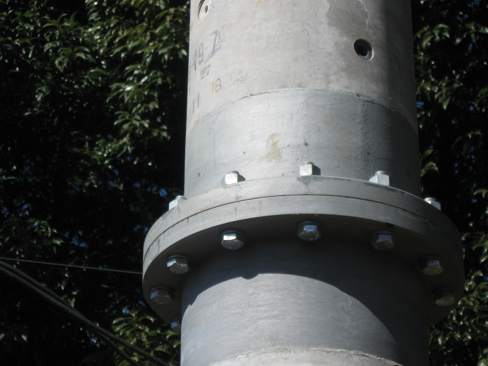 分割部分にフランジを設け、そのフランジ部をボルトで締め付け、接合できる構造。COP(Cap On Pole)キャップオンポールは、篏合タイプのコンクリート継柱。施工も容易で、見た目もスリムな形状。