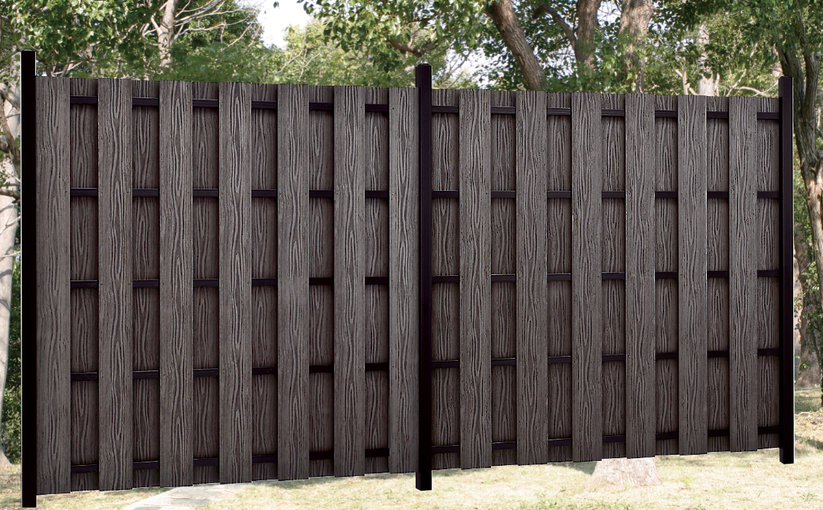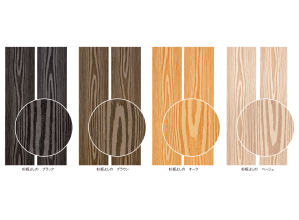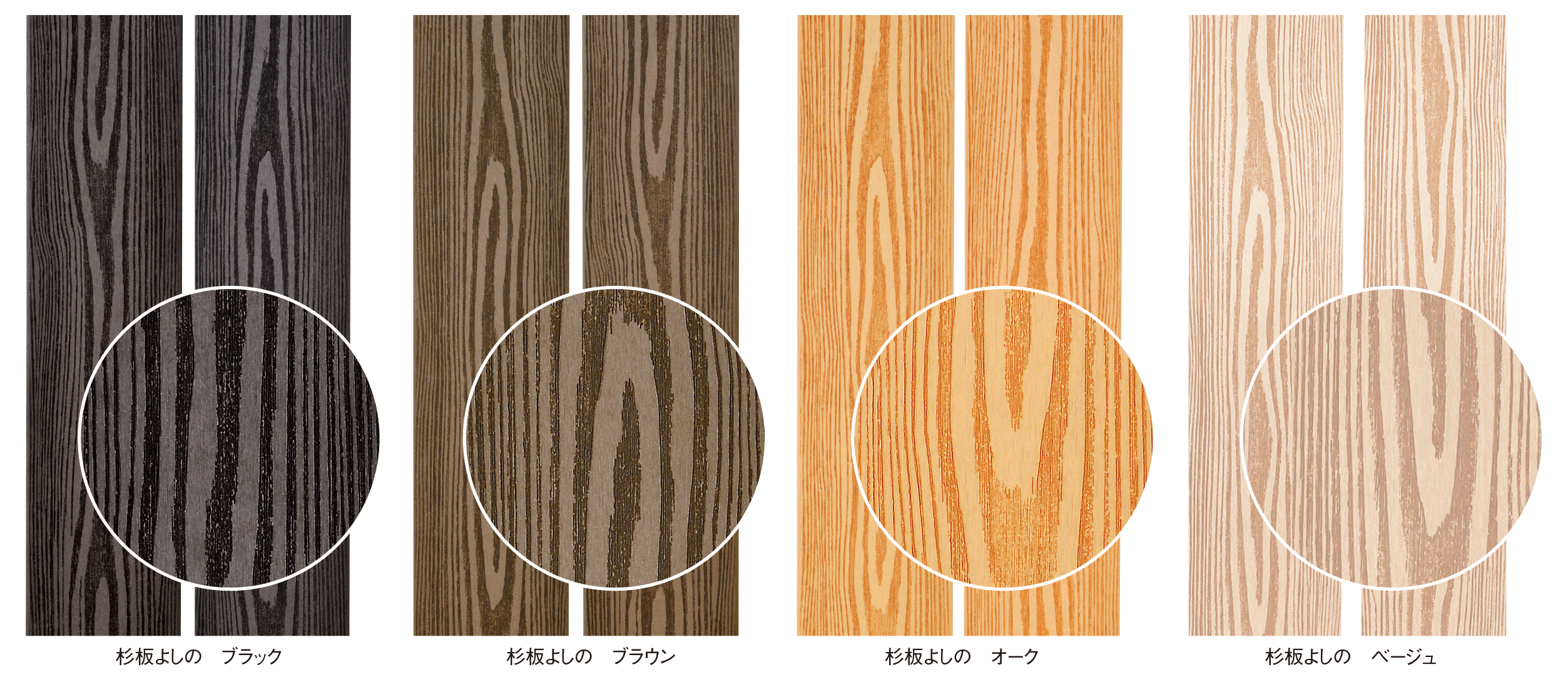 エイコー合成木材「杉板よしの」は丈夫なストランディックス合成木材を芯材に、耐久性に優れた木粉入ポリエチレン樹脂を全面に被膜し、サンディング・エンボス加工した人工杉板。両面木目で2パターンの木目柄により、ナチュラルな印象と高級感を創出。カラーはブラック、ブラウン、オーク、ベージュの4色。